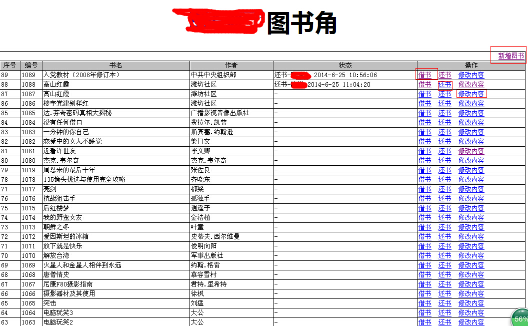 一个简易的图书馆管理小程序 ASP版 发布时间:2014-06-25 11:11:13 · 6576 阅读 · 0 评论 单位工会 应潍坊社区的提议 弄了个图书角 , 咱们就玩电脑化管理了 弄了个ASP版的借书还书程序 不多说了 上个图吧