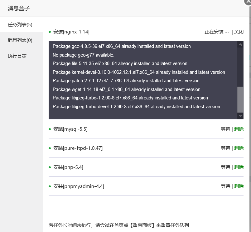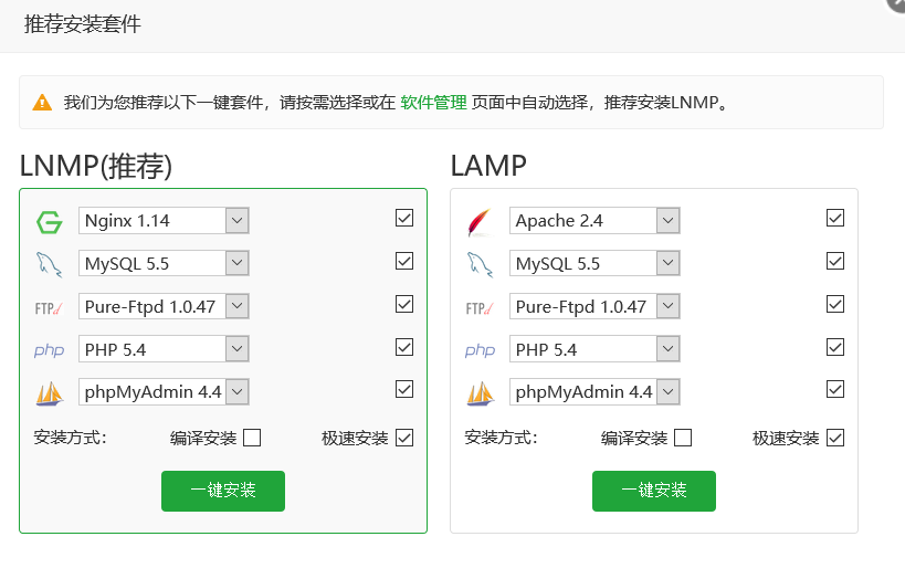 centos7安装宝塔面板 发布时间:2020-11-25 19:01:38 · 4482 阅读 · 0 评论 原贴地址: https://www.cnblogs.com/anweilx/p/12390902.html在终端下执行如下命令yum install -y wget && wget -O install.sh http://download.bt.cn/install/install.sh && sh install.sh这里需要记录好账号密码 在阿里云服务器中需要配置安全组,开放端口,否则无法正常访问 登陆成功后需要安装套件 这里我使用LNMP 成功安装后即可正常使用