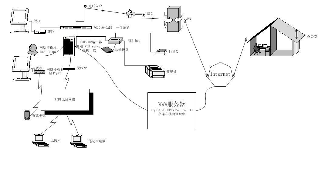 画了个家庭网络的示意图 发布时间:2012-05-22 10:46:12 · 5775 阅读 · 0 评论 依据现在家里的网络布局 画的一个示意图 不算太复杂,主要是玩玩。主要核心是F7D3302 路由器 通过USB HUB 挂接了多个USB设备 移动硬盘 打印机 扫描仪等主要利用移动硬盘 来开设了一个网站 和做脱机下载 一级FTP服务(数据远程备份用的)打印机和扫描仪 平常不连接上去的tomato 可以把路由器做成VPN服务器 这样我在单位也可以轻松的访问到局域网内部的任何网络资源了。这段时间折腾这个网络 也算有点进步 学会了一些LINUX的简单操作 以后有空还会多玩玩的