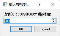 int value1 = QInputDialog::getInt(this, tr("输入整数对话框"), tr("请输入-1000到1000之间的数值"), 100, -1000, 1000, 10, &ok);