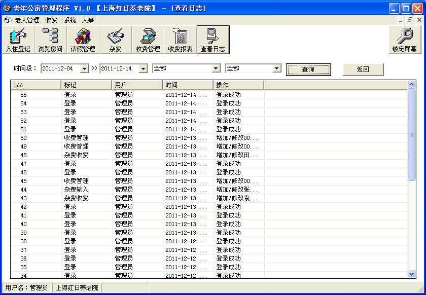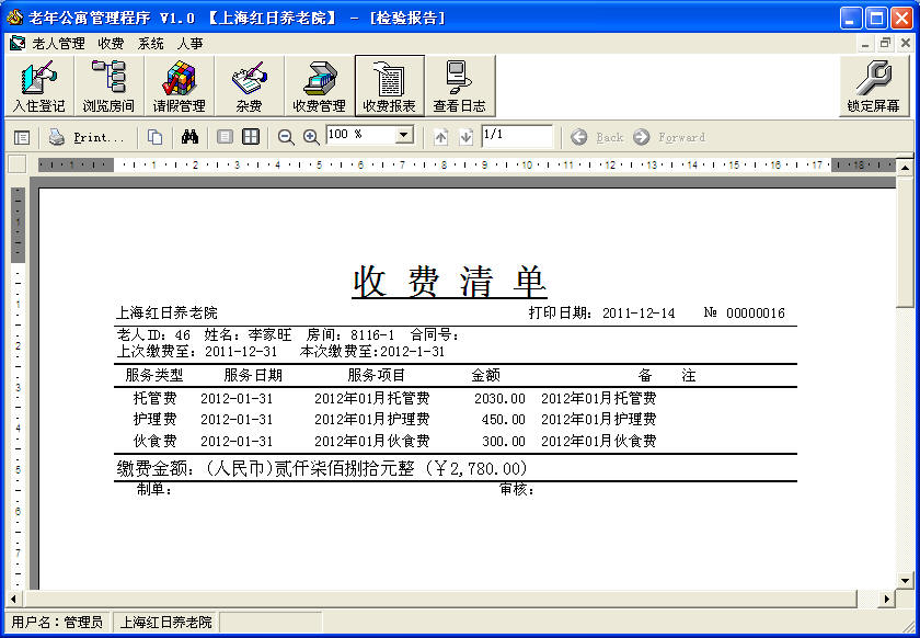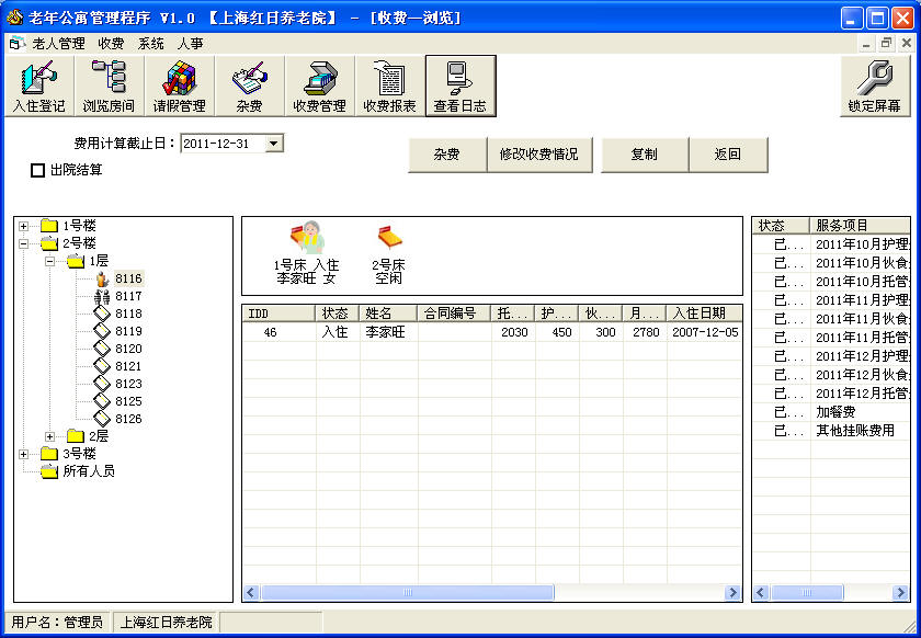 《老人公寓管理系统》是专门针对敬老院管理而开发的一套管理软件。系统主要实现接待管理(来访登记、查询老人信息、查询床位信息、查询员工信息)、老人管理(老人资料、外出登记、老人情况一览表、入住登记、老人健康档案、期间健康档案查询)、费用管理(财务托管、现金使用登记、现金使用查看)、仓库管理(货品信息、货品入库、货品出库、货品库存、出入库查询统计)、院办经济(产品录入、产品录入查看、产品查询统计、产品一览表)、床位管理(楼房资料、房间资料、批量生成房间号)、人事管理(员工信息、员工调动、员工离职、员工请假)、基本信息(民族、国籍、币种、品名)。系统可以方便的查看老人信息、根据老人入住情况及时更新房间信息、可以每天逐笔记录现金使用情况等。
