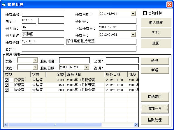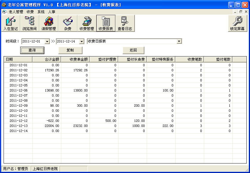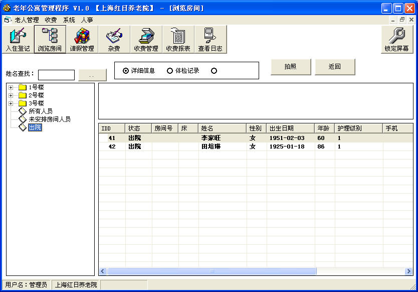 该软件适用于敬老院、托养院等机构福利机构。软件界面设计简洁、美观其人性化的管理可以使用户轻易上手,提升服务质量,提高工作效率。科学的管理方法会给您带来无限的效益,使用该敬老院管理软件将是您明智的选择。